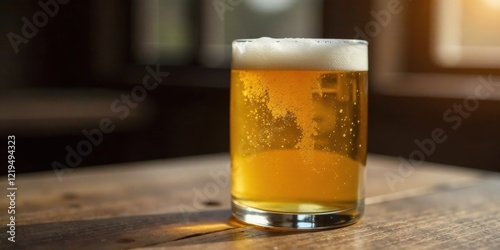 A refreshing glass of golden beer sits on a rustic wooden table, illuminated by soft sunlight filtering through a nearby window, creating a tranquil and inviting atmosphere.