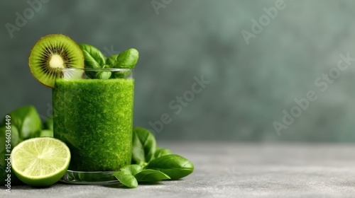 A refreshing glass of green smoothie is garnished with kiwi and lime slices, showcasing vibrant natural ingredients that signify health and vitality in healthier living.