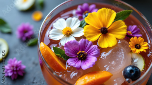 A refreshing glass of Hwachae cocktail topped with colorful edible flowers and fruit slices.