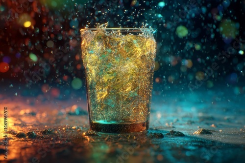 A refreshing golden drink in a glass, with water splashing, capturing a lively vibe.