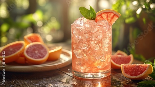 A refreshing grapefruit drink with ice and mint garnish outdoors.
