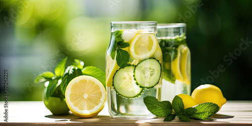 A refreshing homemade lemonade with ice, cucumber, mint, and lemon in a rustic jar.