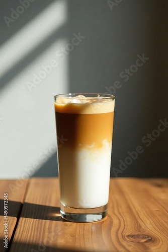 A Refreshing Iced Coffee Drink in a Tall Glass on a Wooden Table, Bathed in Sunlight