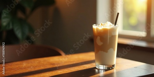 A Refreshing Iced Coffee Drink with Creamy Topping on a Sunny Wooden Table
