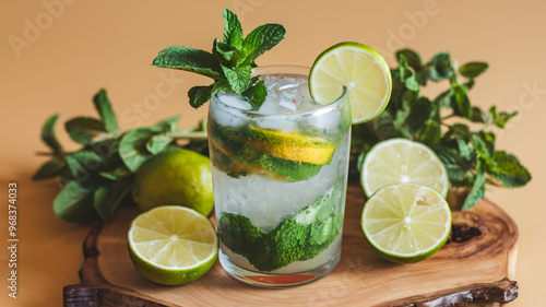 A refreshing mojito with fresh mint leaves and lime slices