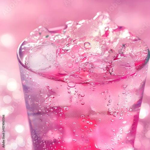 A refreshing pink drink with ice and bubbles in a glass, set against a shimmering background.