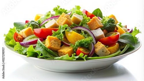A refreshing salad featuring crisp lettuce and crunchy croutons, perfect for a light meal or side dish, bursting with flavor and color. Enjoy fresh bites!