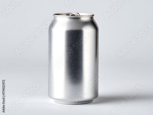A refreshing silver can with water droplets, isolated on a clean, bright background, perfect for a cool beverage.