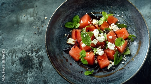 A refreshing watermelon salad with feta, mint, and balsamic glaze. Featuring freshness and tanginess