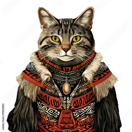 A regal cat adorned in a colorful, intricately designed garment, featuring detailed patterns and jewelry.