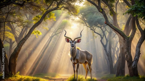 A regal lesser kudu male finds refuge behind the towering trees in a mystical forest, where sunlight seeps