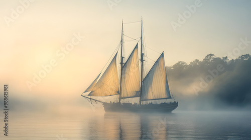 A regal schooner with tall masts sailing smoothly in the early morning mist its sails catching the first light of dawn.
