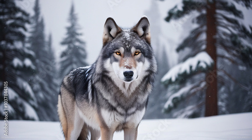 A Regal Wolf Amidst the Snow-Covered Pines: The Watchful Wolf in Frozen Wilderness