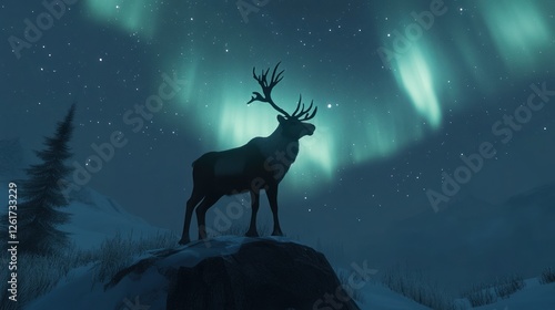 A reindeer standing majestically on a snowy ridge, framed by the dazzling aurora borealis and twinkling stars, embodying the untouched beauty of the Arctic wilderness