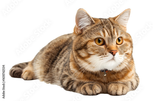 A relaxed brown tabby cat lying on a white background, with a focused gaze and soft fur texture.