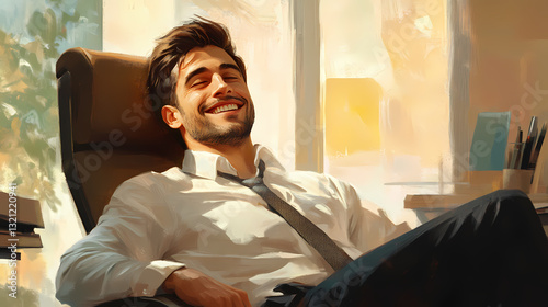 A relaxed businessman enjoying a sunny afternoon in a modern office, with cityscape in the background