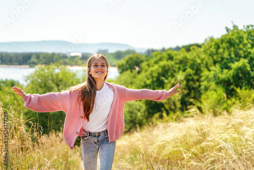 A relaxed girl runs through the fields with her hands raised to the sky in summer. The concept of travel, dreams and freedom.