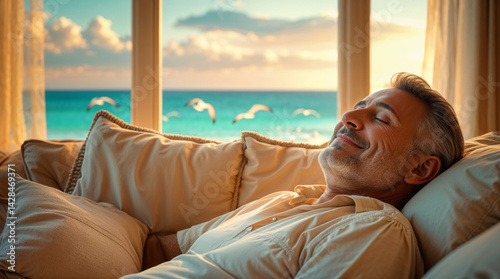 A relaxed man enjoying the ocean view while resting on a sofa in a cozy living room.