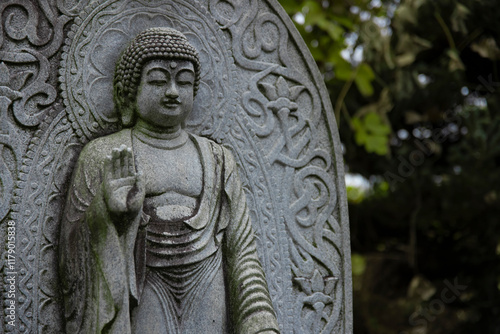 A religious stone statue of Shaka Nyorai at Japanese buddhism temple