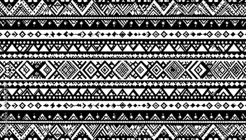 A repeating, graphic pattern featuring geometric shapes and lines. Displayed in black and white stripes, evoking a tribal and ethnic aesthetic