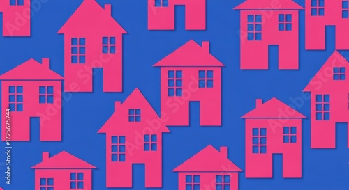 A repeating pattern of stylized pink houses with windows on a vibrant blue background.