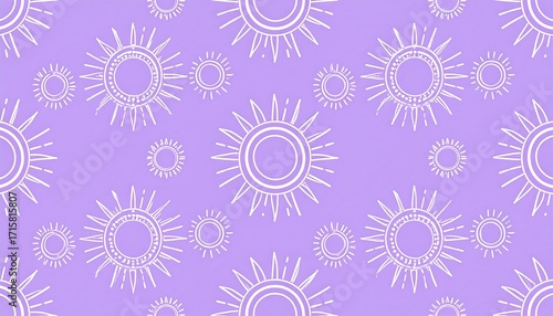 A repeating pattern of stylized suns in white outline against a soft lavender background.
