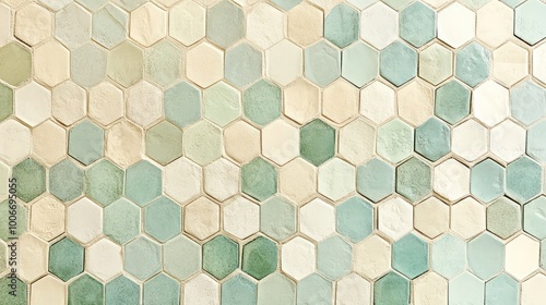 A repeating pattern of tiny hexagons in shades of soft green and cream, forming a delicate, geometric tile design.