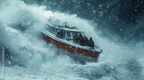 A rescue boat navigating through turbulent, stormy seas with high waves and snow.