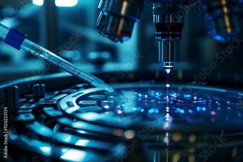 A researcher is utilizing sophisticated microscopy equipment in a laboratory, carefully injecting liquid onto a sample stage under controlled conditions.