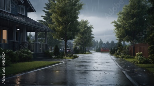 A residential street with houses on either side, a red vehicle parked on the right side, and the street is wet from rain.