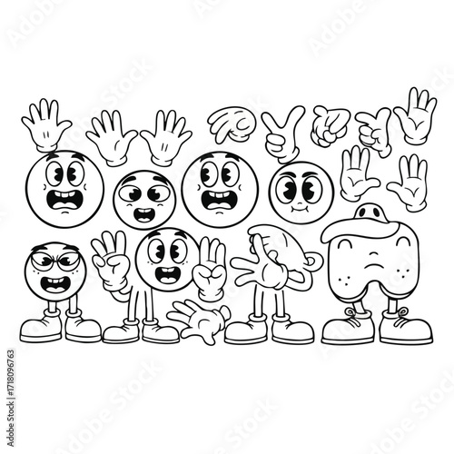 A retro cartoon mascot character creation kit with expressive faces gloved hands and funny poses in a vintage 1930s style.