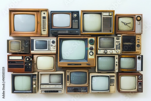 A retro composition featuring two stacks of old-fashioned televisions TV