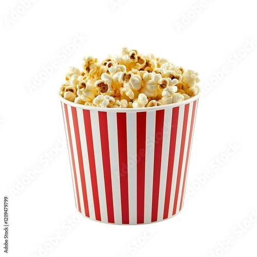A retro popcorn bucket with red and white stripes, overflowing with popcorn, isolated on a white background.