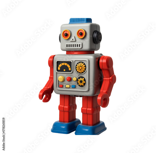 A retro tin toy robot with red limbs and a grey body, isolated on transparent background