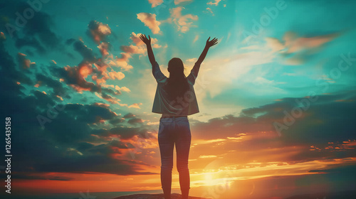 A Retro-Filtered Image of Success and Freedom. Back View of Female Figure Celebrating an Emotional Moment in a Beautiful Evening Landscape. Conceptual Photo Emphasizing Lifestyle Achievement and Perso