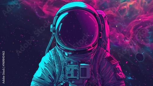 A retro-futuristic astronaut with a US flag on their shoulder stands in front of an abstract cosmos.