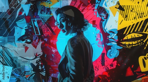 A retro-inspired abstract collage with comic book elements, neon colors, and fragmented imagery