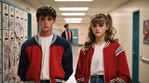 A retro-inspired scene featuring two teenagers in matching red jackets walking down a school hallway.