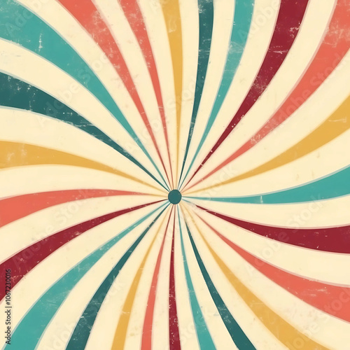 A retro-style, abstract graphic featuring a spiral pattern radiating from the center.
