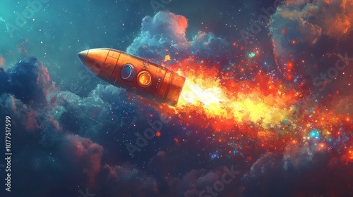 A retro-style rocket ship bursts through the clouds, leaving a fiery trail of exhaust. The sky behind is filled with glowing stars and nebulae.