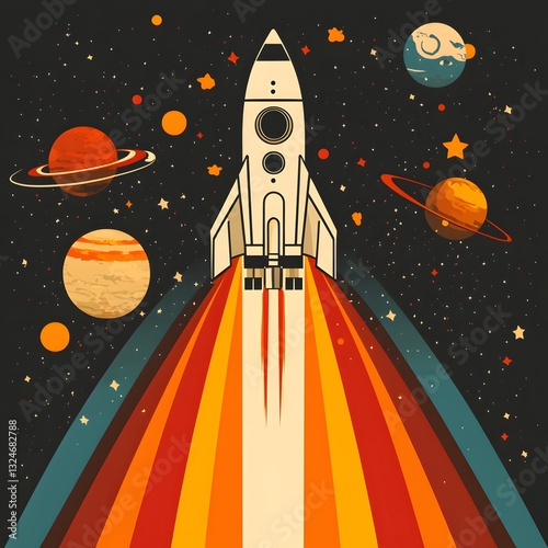 a retro-style rocket ship launching into space, surrounded by planets, stars, and a vibrant trail