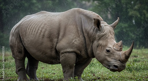 A rhino stands in grassy field during rainfall Its large gray and has prominent horns
