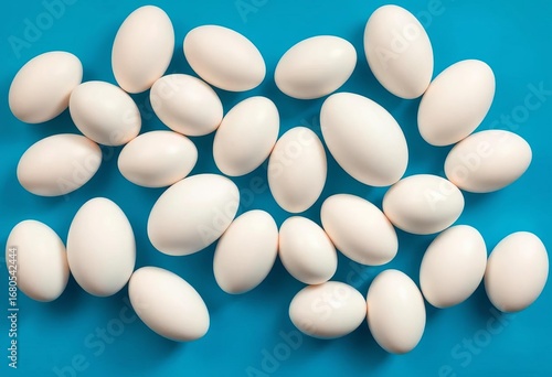 A rhythmic arrangement of pristine white chicken eggs on a vibrant blue backdrop, copy space, white