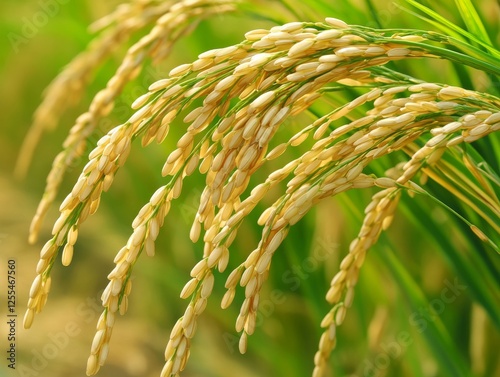 A rice plant with grains close-up. Featuring detailed textures and natural color. Emphasizing the growth and development of rice. Ideal for agricultural studies and educational content.