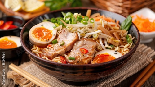 A rich and flavorful bowl of ramen noodles served with an array of toppings including soft-boiled eggs, tender slices of pork, bean sprouts, and fresh green onions for an appetizing dish.