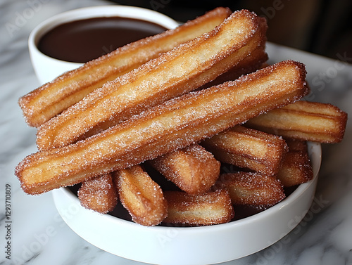 A rich and velvety Spanish churros con chocolate dusted with cinnamon sugar.