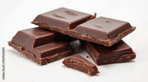 A rich dark chocolate bar broken into pieces, elegantly arranged on a plain white surface. The glossy texture of the chocolate glistens under soft lighting.