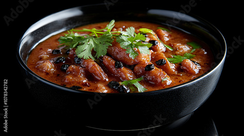 A rich, flavorful bowl of beans in a spicy, aromatic sauce garnished with fresh herbs, set against a black background.