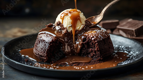 A rich molten chocolate cake with a gooey center, topped with a drizzle of caramel sauce and served with a scoop of rich chocolate ice cream.