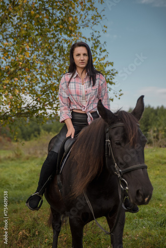A rider on horseback, a picturesque landscape. The concept of equestrian leisure.